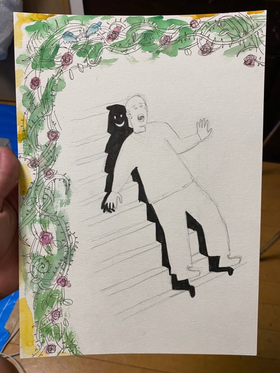 紙に水彩、色鉛筆、鉛筆、ペンなど