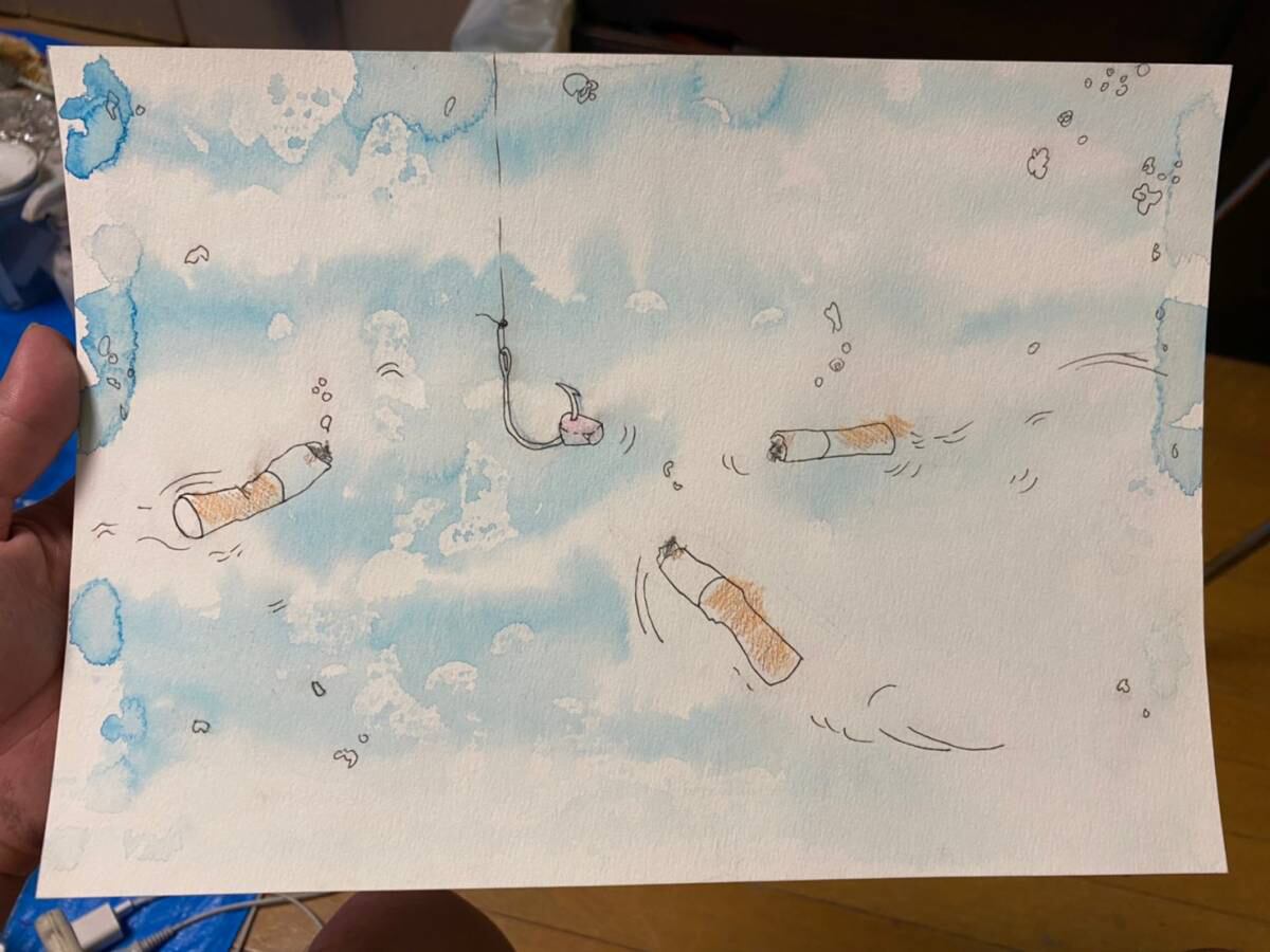 紙に水彩、色鉛筆、鉛筆、ペンなど