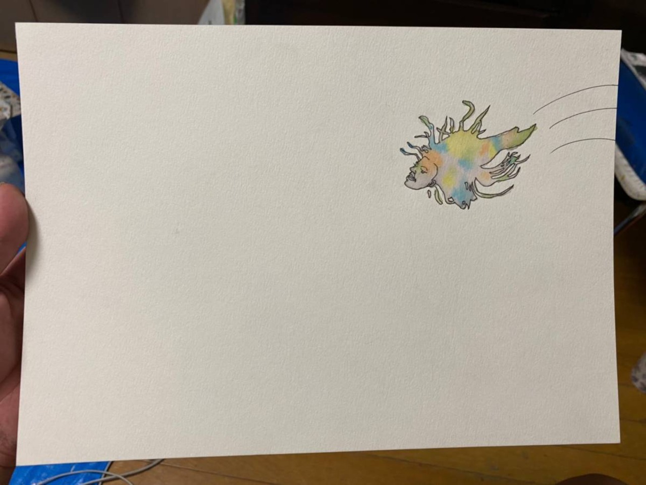 紙に水彩、色鉛筆、鉛筆、ペンなど