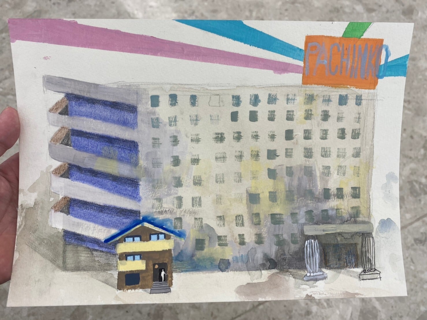 紙に水彩、色鉛筆、鉛筆、ペンなど