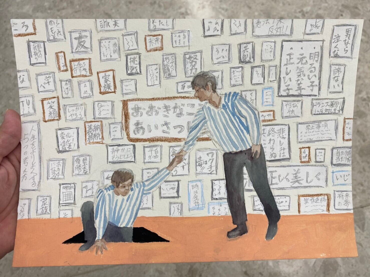 紙に水彩、色鉛筆、鉛筆、ペンなど