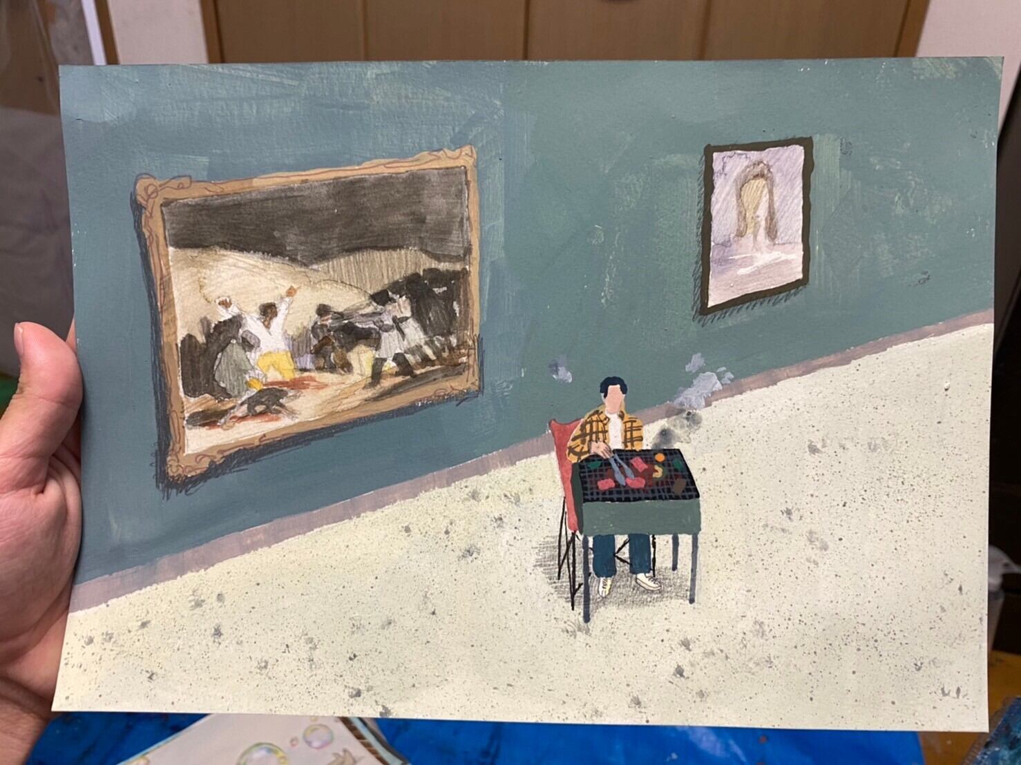 紙に水彩、色鉛筆、鉛筆、ペンなど