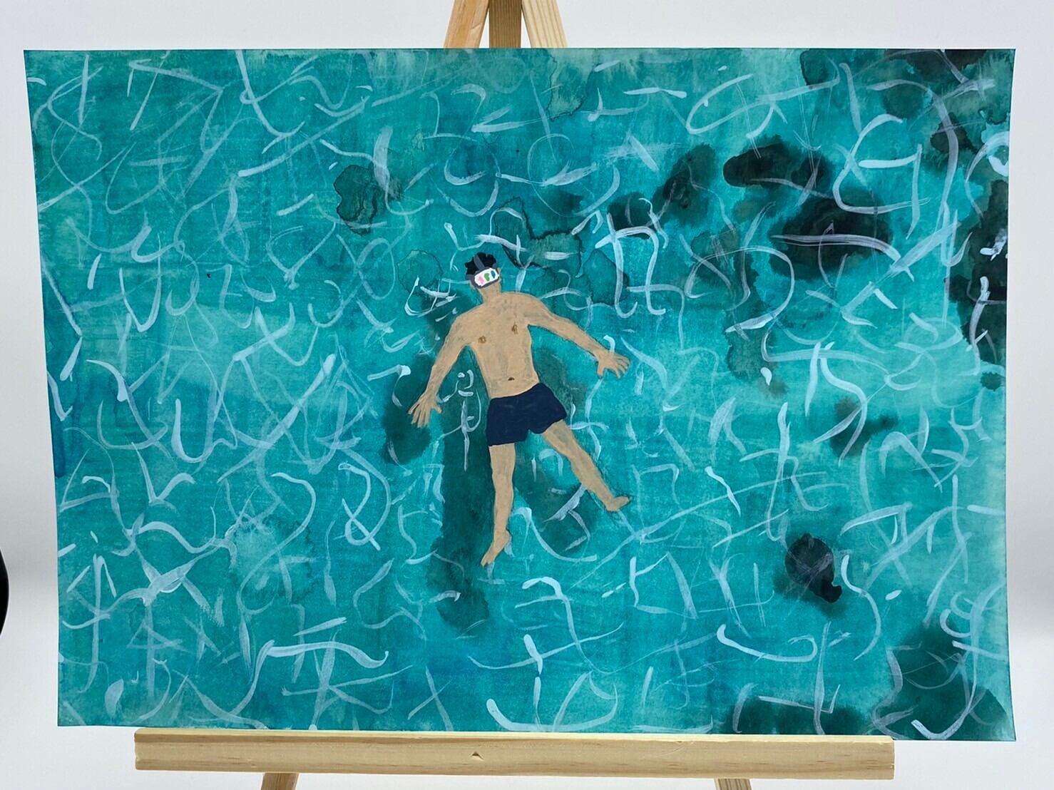 紙に水彩、色鉛筆、鉛筆、ペンなど