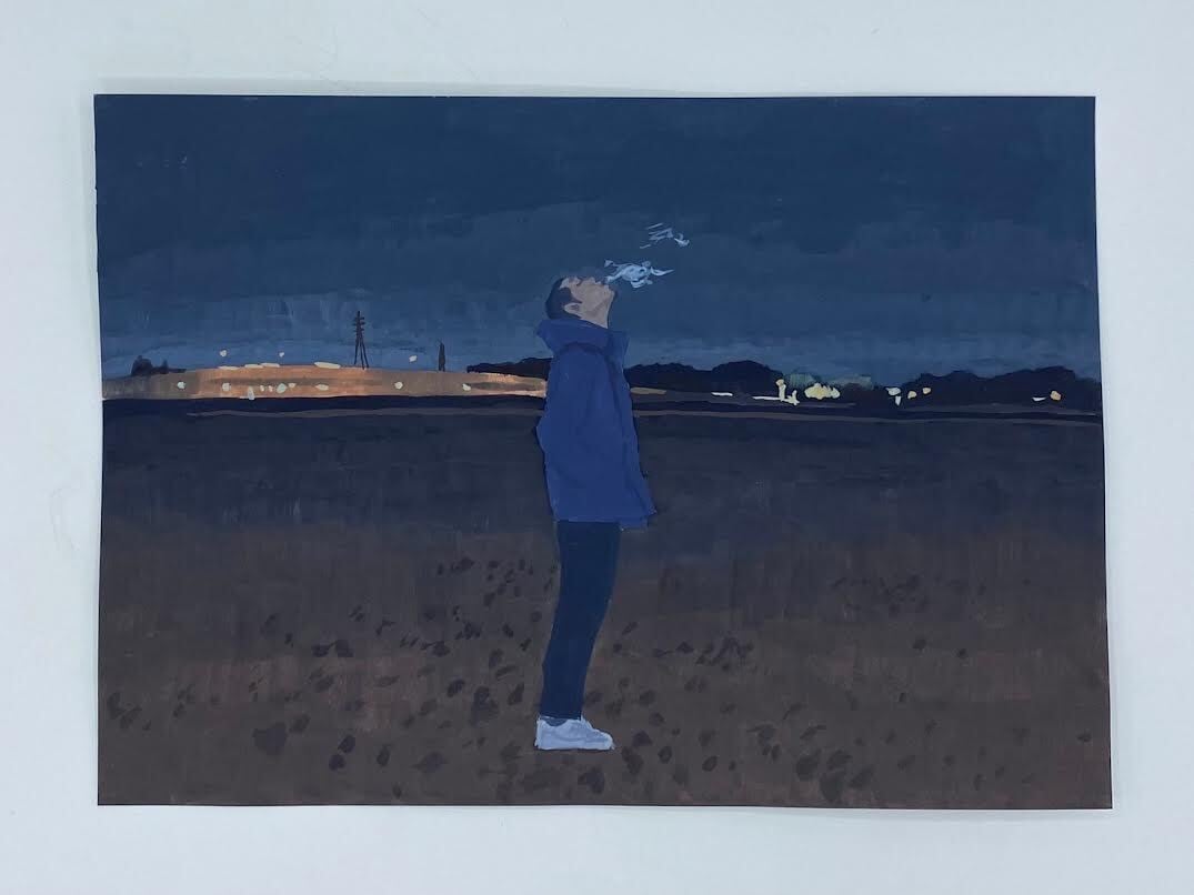 紙に水彩、色鉛筆、鉛筆、ペンなど
